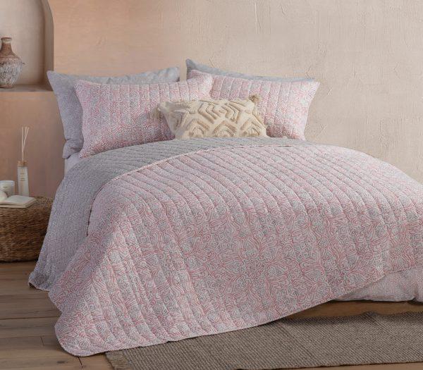 Κουβερλί 2 Όψεων Roman από την Nef-Nef σε μονή διάσταση 180×240 και ροζ χρώμα. Είναι κατασκευασμένο από 100% microfiber, ενώ εσωτερικά διαθέτει 100% πολυεστέρα, υλικά που προσδίδουν μαλακή και απαλή αίσθηση κατά την επαφή με το δέρμα, καθώς και την ιδανική ζεστασιά κατά τους μεταβατικούς μήνες της άνοιξης και του φθινοπώρου, όπως και τις πιο δροσερές καλοκαιρινές νύχτες. Διαθέτει πολύχρωμο λαχούρ σχέδιο στην πάνω πλευρά και γκρι απόχρωση με λευκές λεπτομέρειες στην κάτω πλευρά. Συνδυάζεται με το αντίστοιχο σετ από μαξιλαροθήκες από την Nef-Nef.