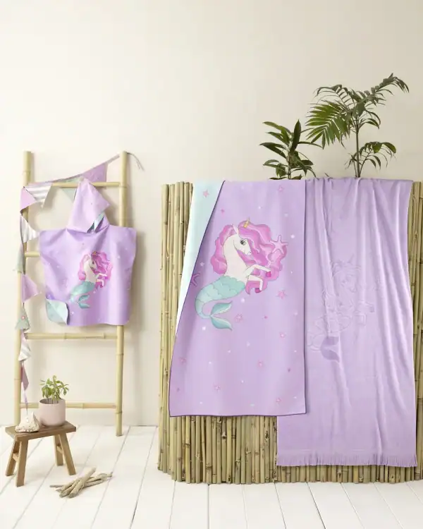 Παιδικό πόντσο θαλάσσης για ηλικίες 3 έως 5 ετών, ιδανικό για τις καλοκαιρινές εξορμήσεις στην παραλία. Το 100% microfiber υλικό προσφέρει απαλή υφή και γρήγορο στέγνωμα, ενώ το λιλά-μωβ χρώμα δίνει μια χαρούμενη νότα στο παιδικό ντύσιμο για τη θάλασσα.