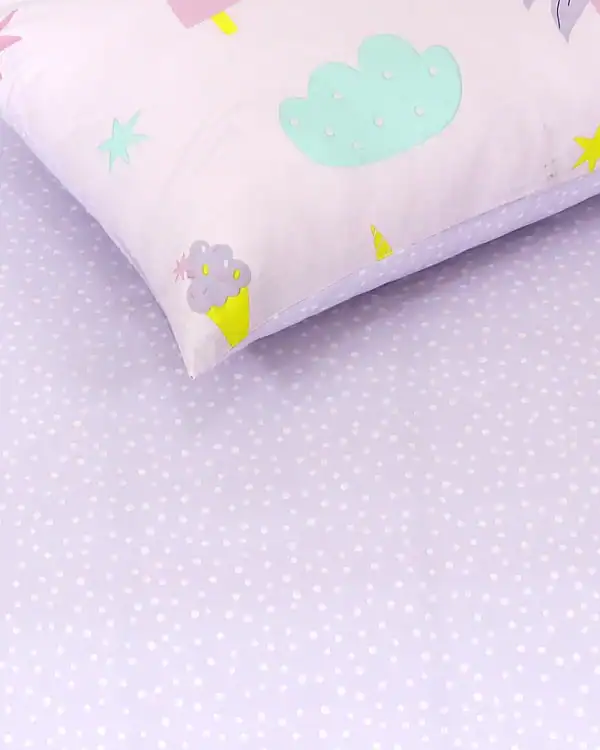 Διαστάσεις σετ: σεντόνι με λάστιχο 100 x 200+30 εκ., απλό σεντόνι 160 x 260 εκ., και μία μαξιλαροθήκη 52 x 72 εκ. — κατάλληλα για μονά παιδικά κρεβάτια, προσφέροντας τέλεια εφαρμογή και άνεση στη χρήση. Τα χρώματα ροζ και λιλά φέρνουν παιχνιδιάρικη και φωτεινή νότα στη διακόσμηση.