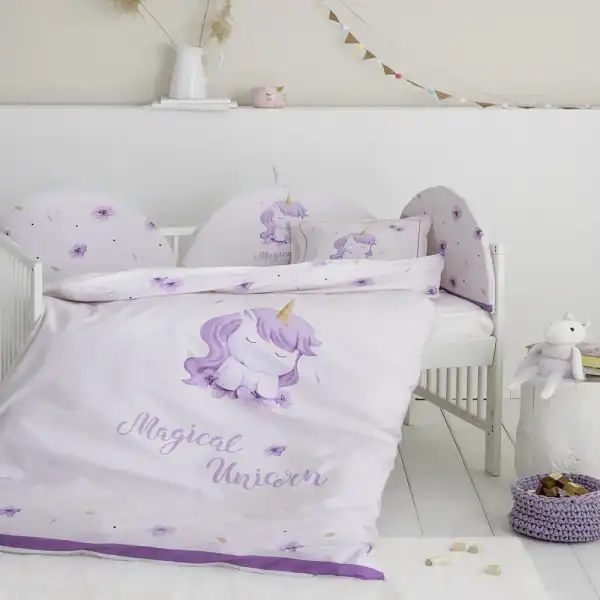 Η βαμβακερή σύνθεση επιτρέπει τη ρύθμιση της θερμοκρασίας, αποτρέποντας την υπερθέρμανση, ενώ είναι ανθεκτική και εύκολη στη φροντίδα. Το παιχνιδιάρικο σχέδιο με μαγικό μονόκερο προσθέτει μια χαρούμενη και παραμυθένια αισθητική στο βρεφικό δωμάτιο, δημιουργώντας ένα φιλικό και όμορφο περιβάλλον για το μωρό.